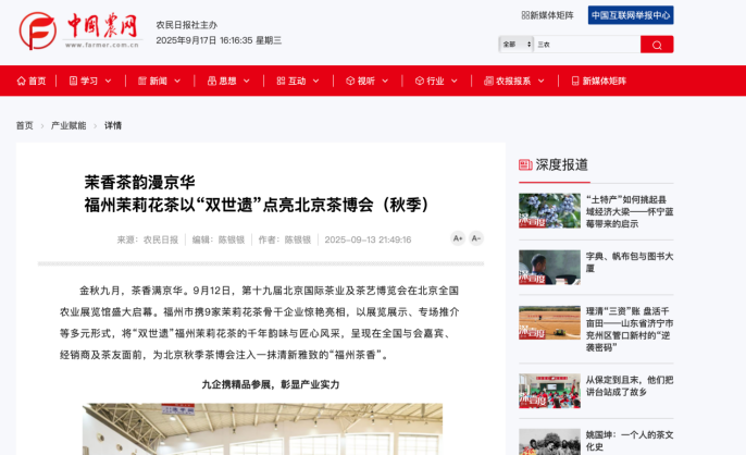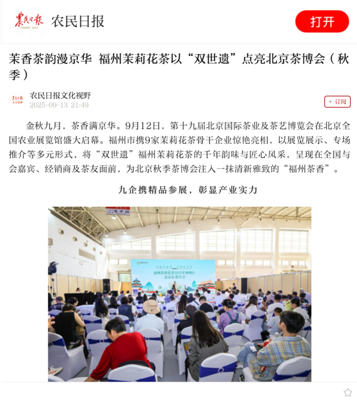 农民日报:茉香茶韵漫京华 福州茉莉花茶以“双世遗”点亮北京茶博会(秋季)