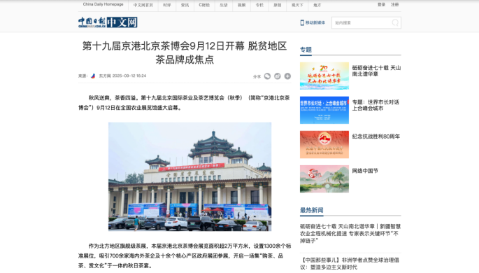 中国日报网:第十九届京港北京茶博会9月12日开幕 脱贫地区茶品牌成焦点