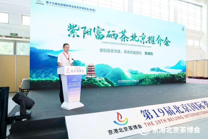 第十九届北京国际茶业及茶艺博览会举办期间,紫阳县委常委、紫阳县政府副县长陈德钧带队组团参展,并于9月13日上午举行紫阳富硒茶专场推介会。推介会上,紫阳县委常委、紫阳县政府副县长陈德钧发表致辞。从紫阳富硒茶历史文化、发展历程、品牌建设、市场拓展等方面全面推介了紫阳富硒茶,展现了将紫阳茶打造为国内外知名的茶叶品牌的决心。