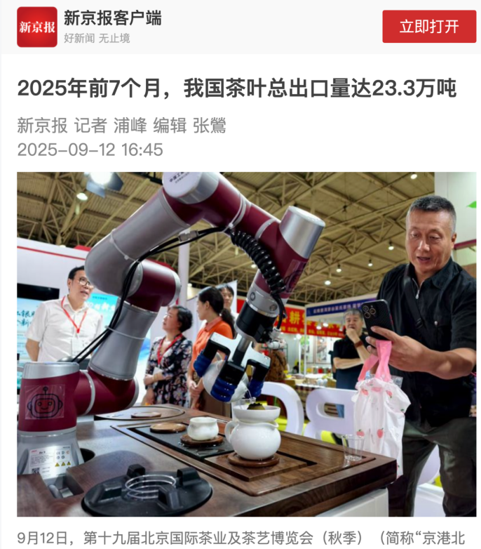 新京报客户端:2025年前7个月,我国茶叶总出口量达23.3万吨