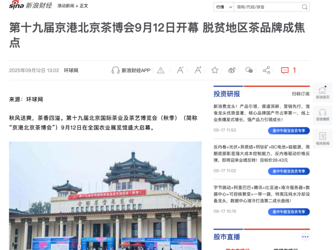 新浪网:第十九届京港北京茶博会9月12日开幕 脱贫地区茶品牌成焦点