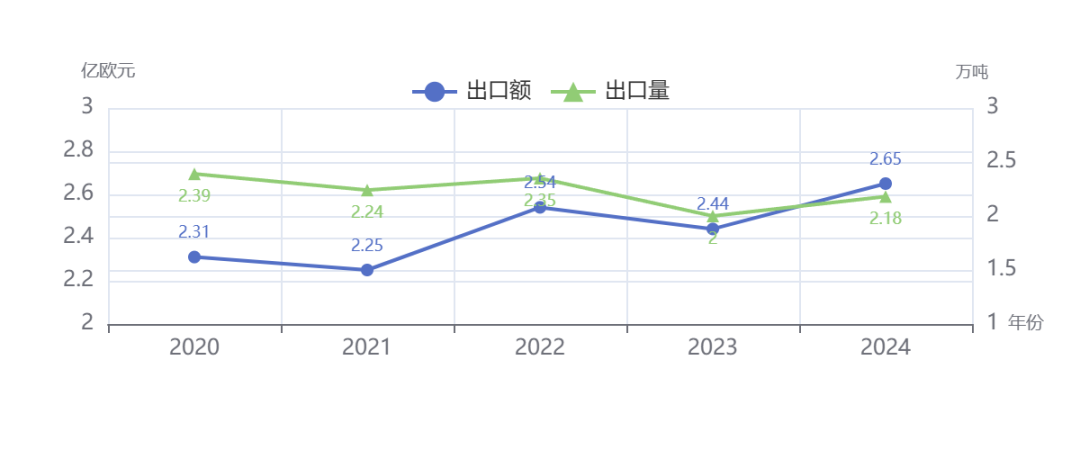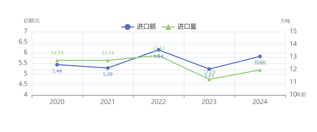 2024年,欧盟茶叶贸易整体呈现增长态势。进口额达5.83亿欧元,同比增长11.45%;进口量11.98万吨,同比增长6.61%;均价4.87欧元/Kg,增长4.54%。出口额2.65亿欧元,同比增长8.63%;出口量2.18万吨,同比增长9.30%;均价12.13欧元/Kg,下降0.61%。