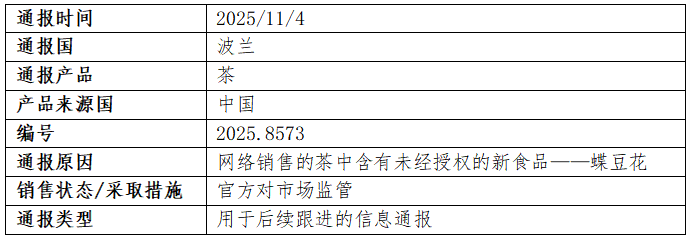 2025年11月4日,欧盟委员会通报了1例我国出口茶叶的不合格案例,主要原因是产品中含有未经授权的新食品成分——蝶豆花。