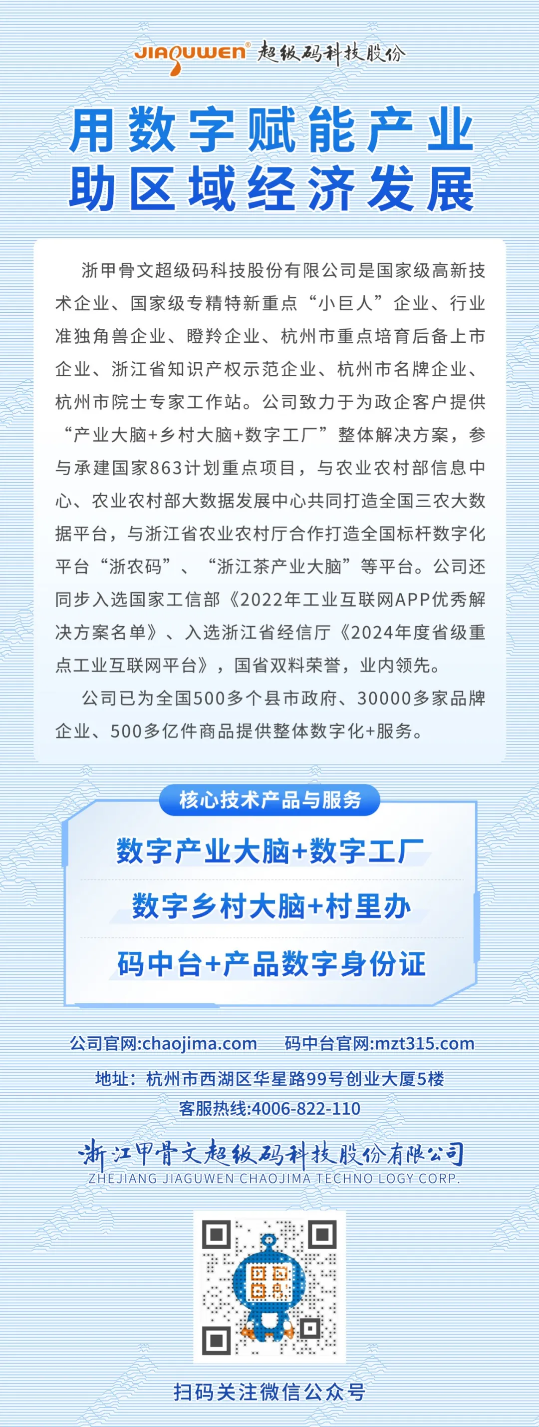 “浙农码”是超级码科技股份为浙江省农业农村厅打造的农业农村领域专用码,以二维码为载体,为全省涉农的人、物、组织建立统一数字身份;“浙农码”为农业主体、农产品、资源装备和美丽乡村实现统一数据汇聚;“浙农码”通过标识、溯源、预警三大功能在“三农”领域构建统一服务集成。