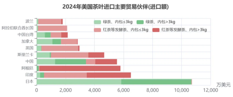 从一组数据我们来看这个现象,2024年美国茶叶进口额前5贸易伙伴依次为日本、印度、阿根廷、中国、斯里兰卡。日本的进口额是10719.36万美元,排在第一,增长2.71%;进口量为3289.86吨,增长4.17%,每公斤32.58美元。日本出口到美国的绿茶3公斤以内和3公斤以上占比差距不大。从日本出口到美国的数据可以清晰地反映出美国市场对高品质的名优绿茶需求和市场都在增长。